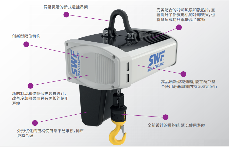 新款起升電機(jī)和全新設(shè)計(jì)的散熱片提供了更好的冷卻效果,繼而延長(zhǎng)使用壽命。 此外,ATHLO系列頗具匠心的限位觸發(fā)機(jī)構(gòu)設(shè)計(jì)新穎葫蘆 ,使 限位無(wú)論是在常規(guī)使用抑或極端條件下均能完美工作。